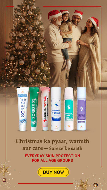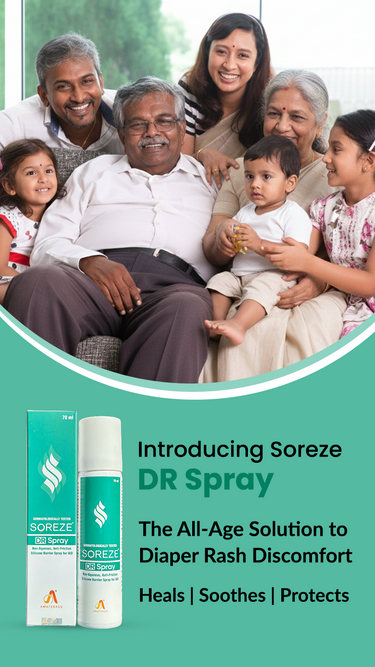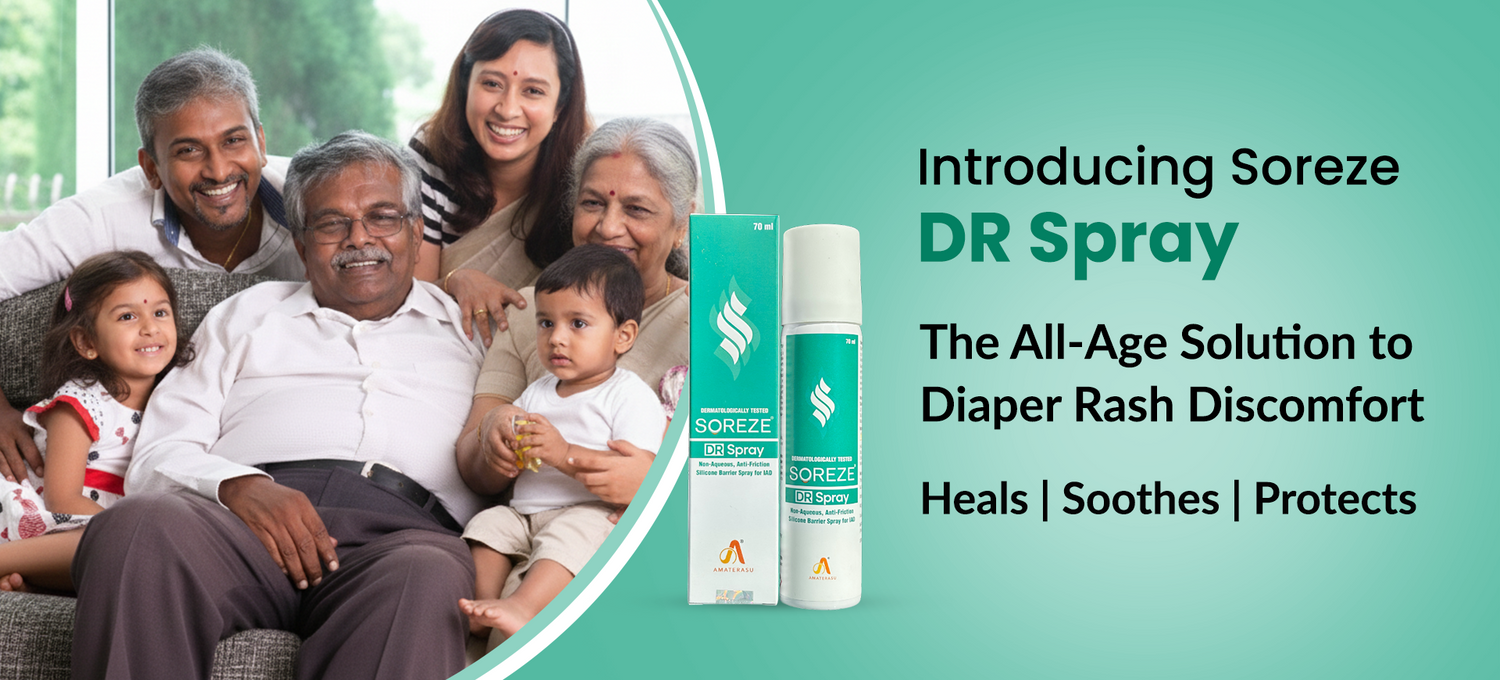 Soreze DR Spray is a touch-free, clinically proven solution designed to treat existing rashes and prevent new ones from forming. Its advanced, hypoallergenic formulation creates a long-lasting, water-resistant barrier film that protects the skin from urine, moisture, sweat, and fecal matter—common triggers of diaper rashes in babies, adults, and seniors.