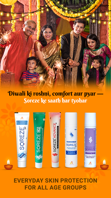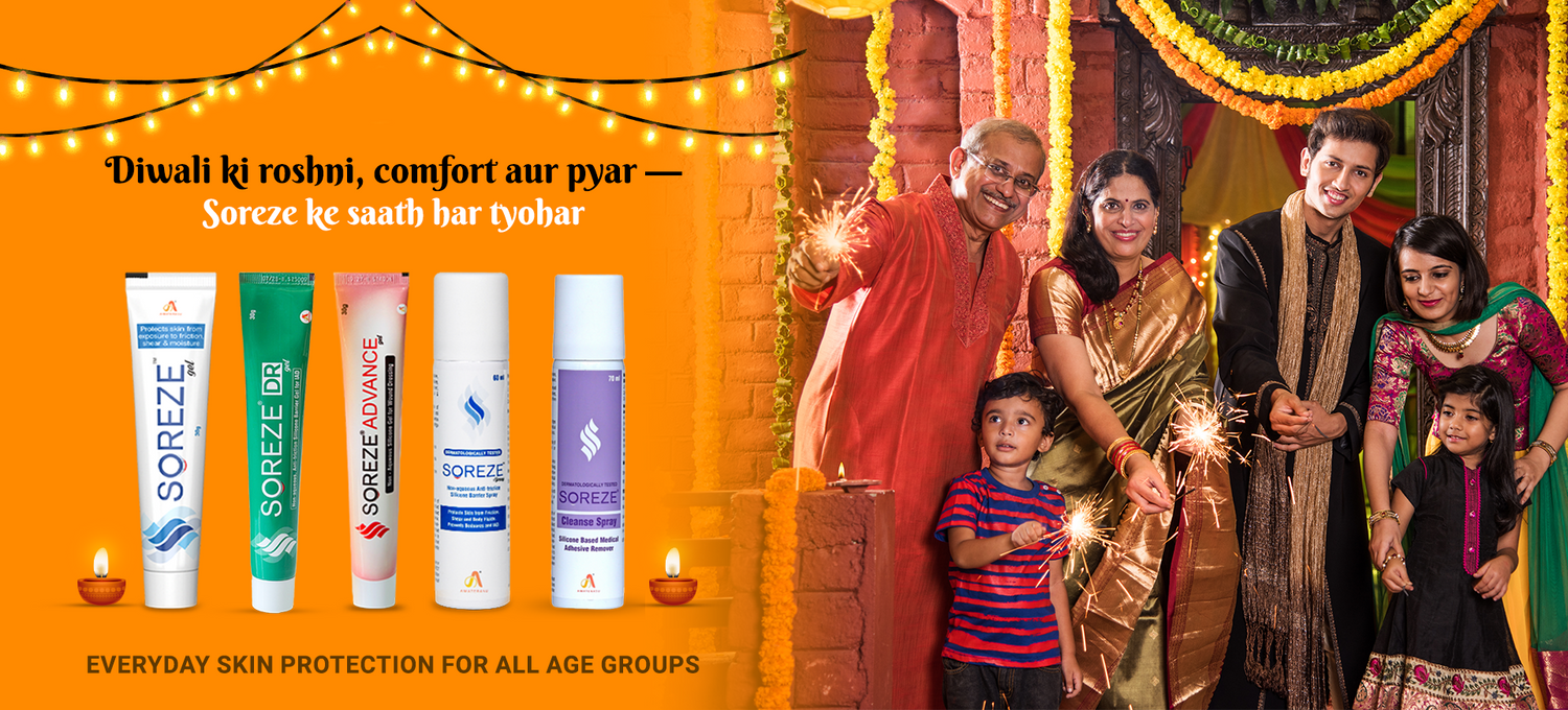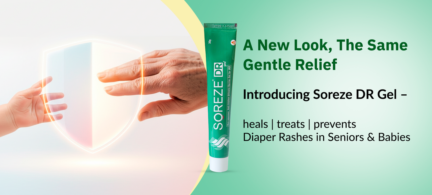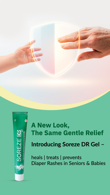 Patented Soreze Diaper Rash Gel is scientifically designed to treat and protect delicate skin—whether of seniors or babies—from painful diaper rashes. It forms a thin, long-lasting, water-repellent, and breathable protective barrier film that prevents direct contact of skin with urine, faeces, and moisture.