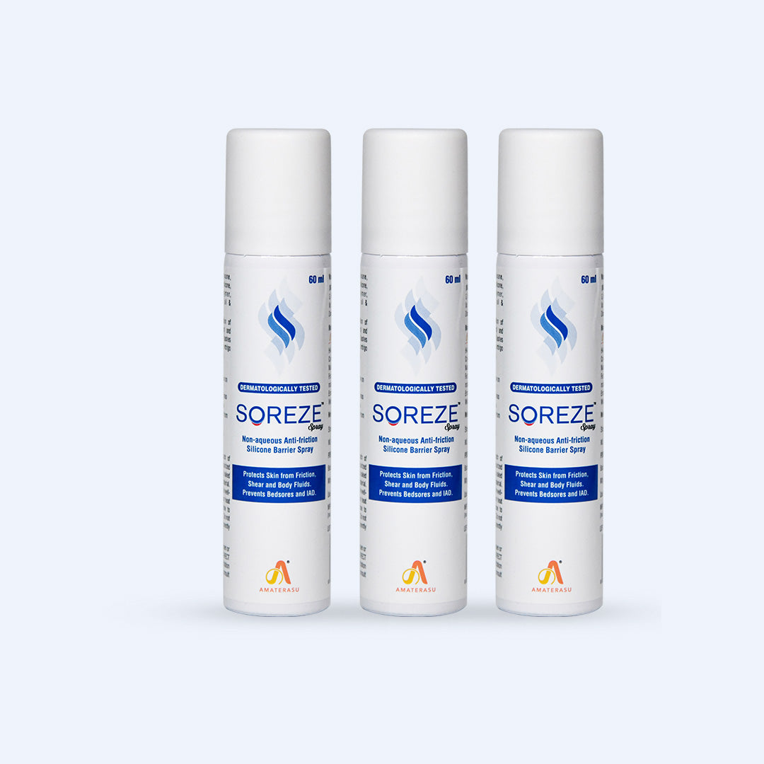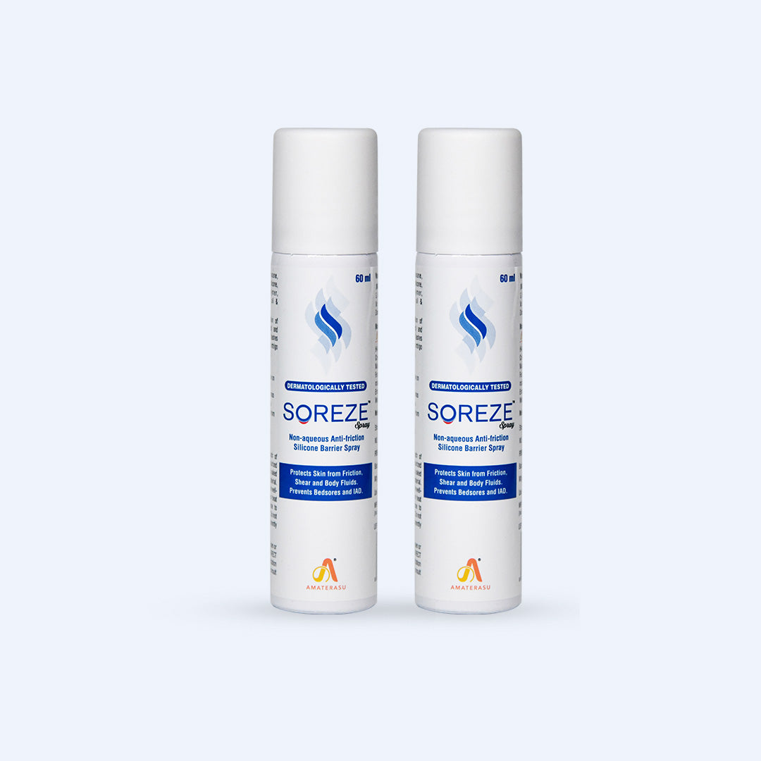 The alcohol-free formula of Soreze Spray is easy to apply and dries up quickly to form a long-lasting, water-repellent, protective barrier film that reduces friction and inhibits direct contact between skin, urine, and other body fluids. This barrier film protects skin exposed to irritation from urine, stool, and other body fluids thus preventing diaper rash & helps relieve skin irritation or redness in pressure-prone areas.
