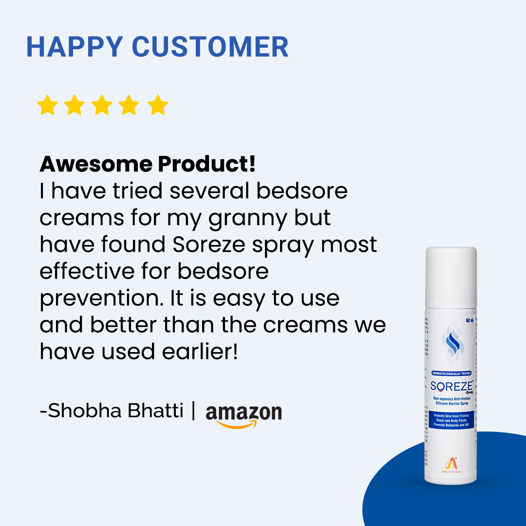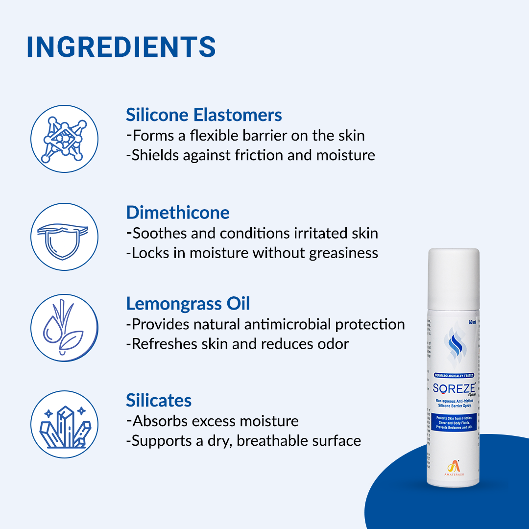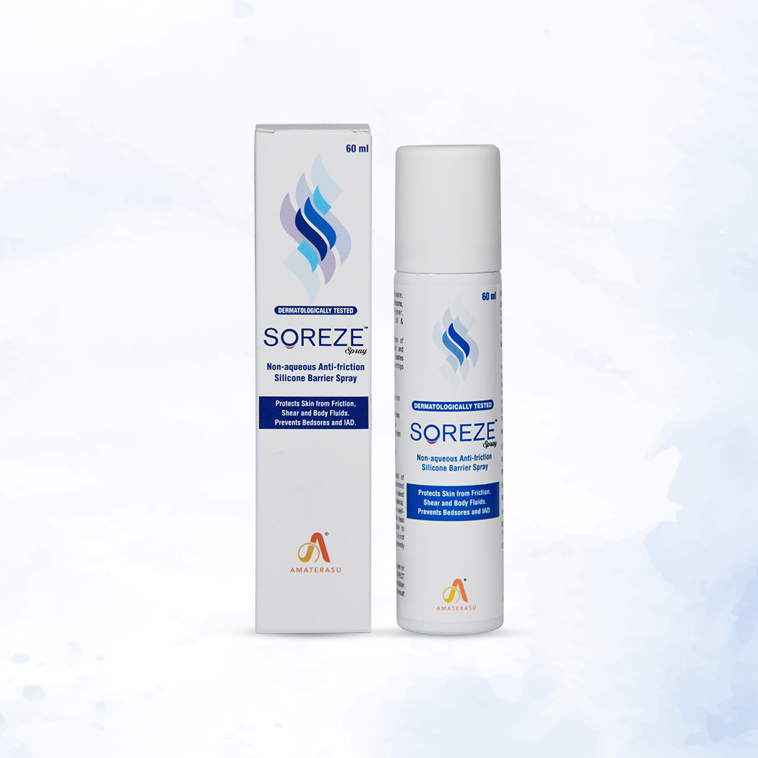 Soreze Spray is a no-sting, non-sticky, non-skin protectant barrier film made of silicone elastomers and dimethicones that prevents bedsores and adult diaper rashes.