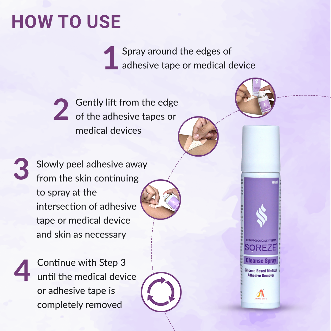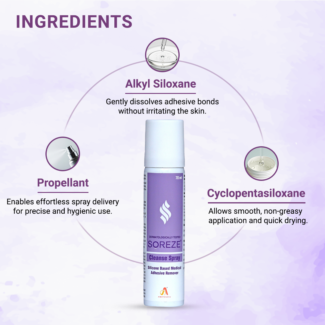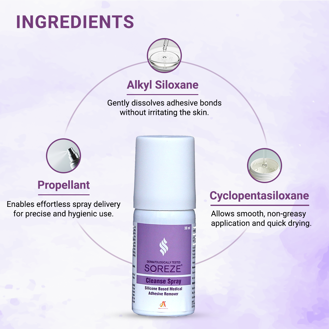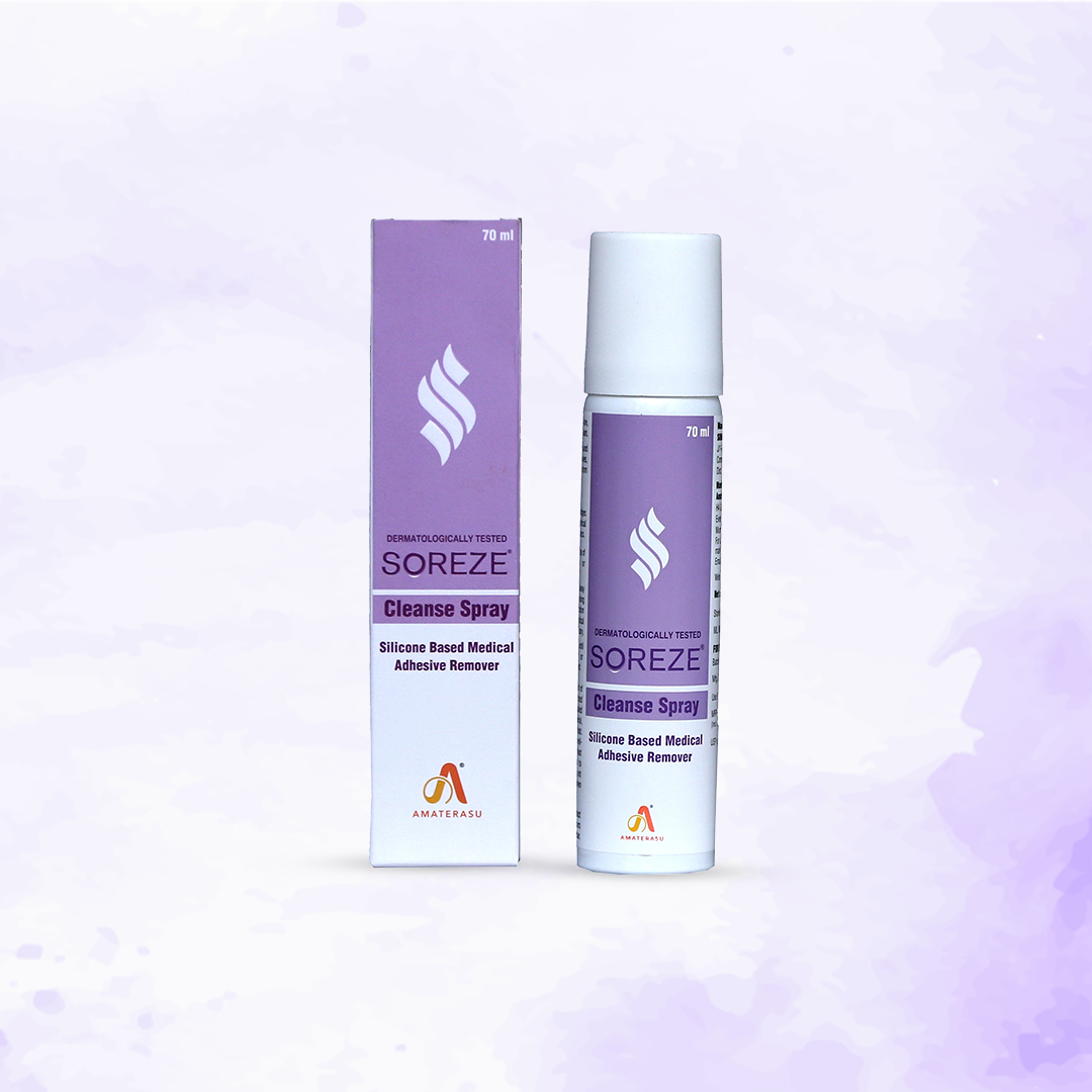 Soreze Cleanse Spray is no – sting, non-alcoholic, silicone solvent which rapidly disrupts the bonding of medical adhesive to the skin, causing easy removal of medical tapes, dressing and medical devices from the skin.