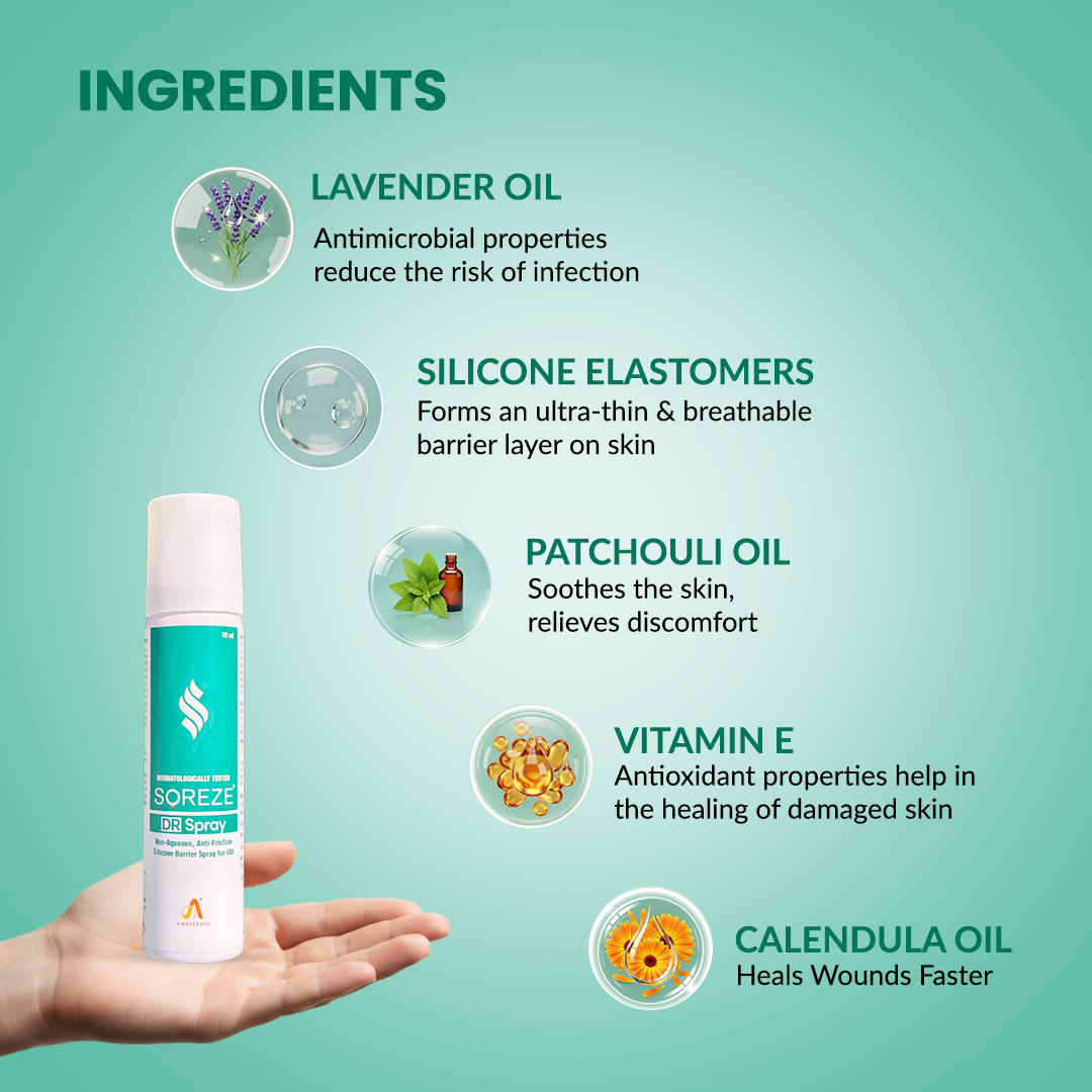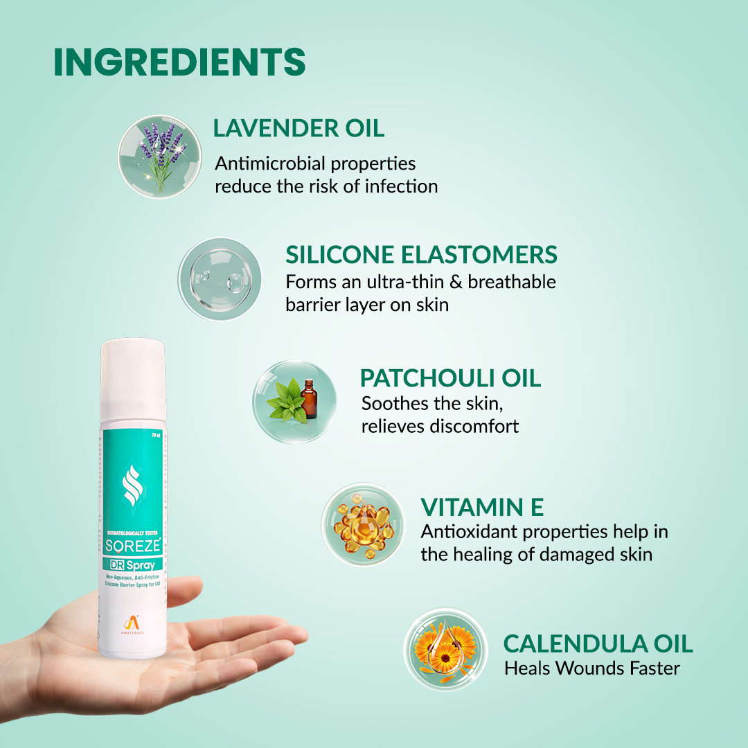 Soreze DR Spray contains Silicone Elastomers, Natural Essential oils (Calendula, Lavender, Patchouli), Calamine and Vitamin E.