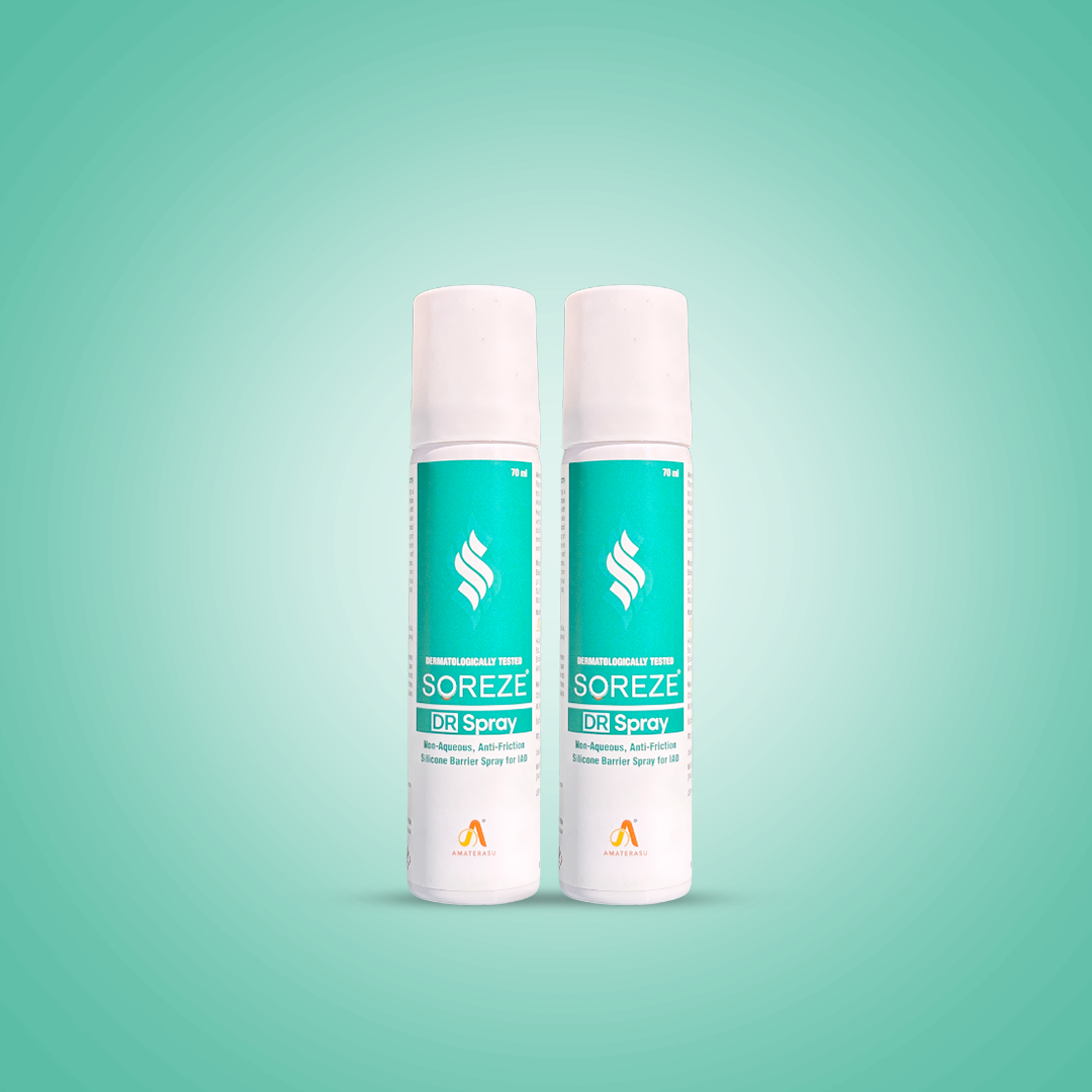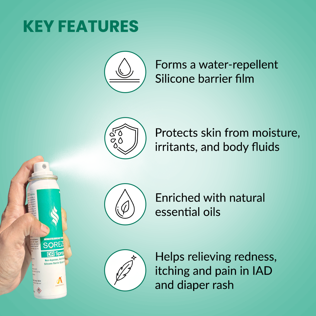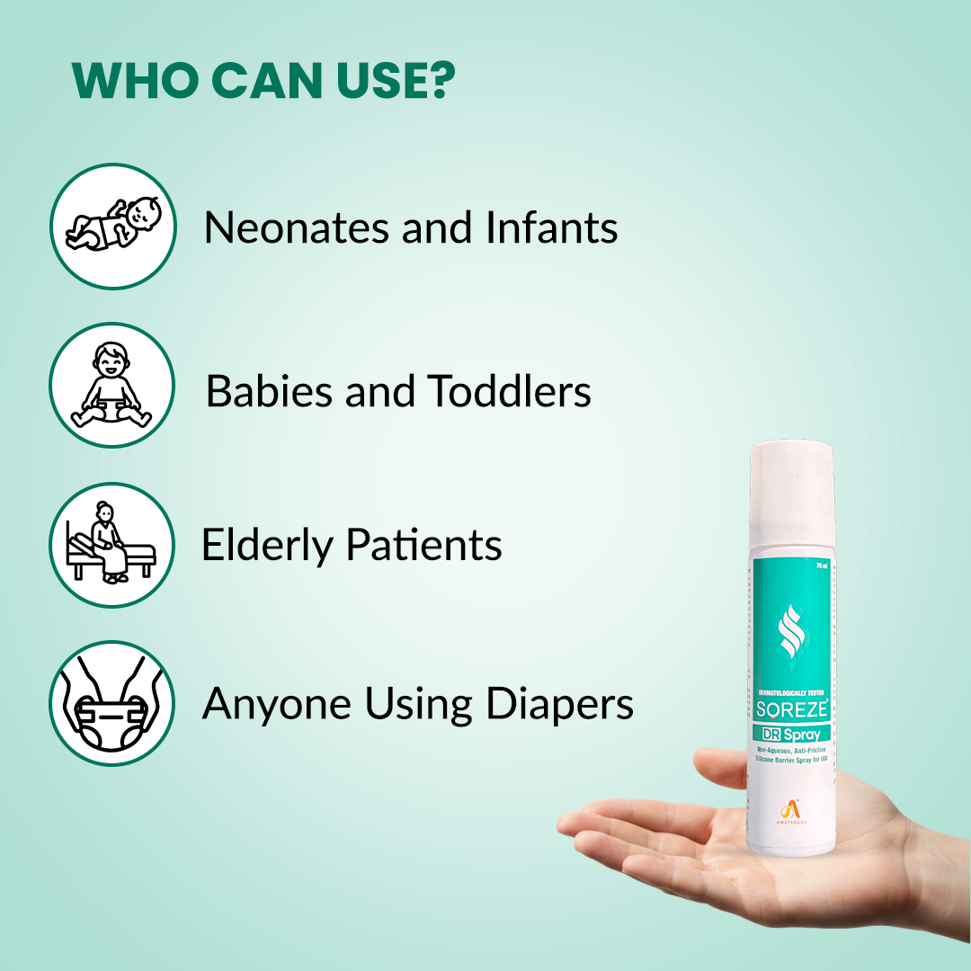 Soreze DR Spray is a touch-free, clinically proven solution designed to treat existing rashes and prevent new ones from forming. Its advanced, hypoallergenic formulation creates a long-lasting, water-resistant barrier film that protects the skin from urine, moisture, sweat, and fecal matter—common triggers of diaper rashes in babies, adults, and seniors.