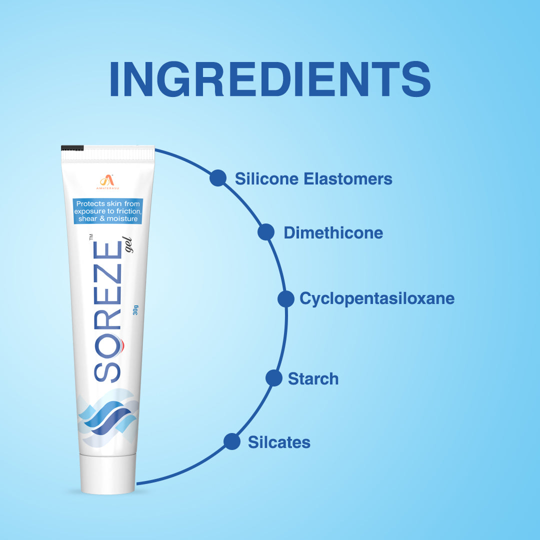 SOREZE is formulated using unique and patented EPB technology. SOREZE contains silicone elastomers that have elastic properties. Elastomers are characterized by high elongation and flexibility or elasticity of the film thus prevents breaking or cracking of the film and gives long lasting protection. Silicone elastomers are used widely in healthcare and Pharma applications such as pacifiers, medical prostheses, cosmetics, pharmaceutical products etc due to their excellent thermal and chemical resistance and most importantly well documented safety.