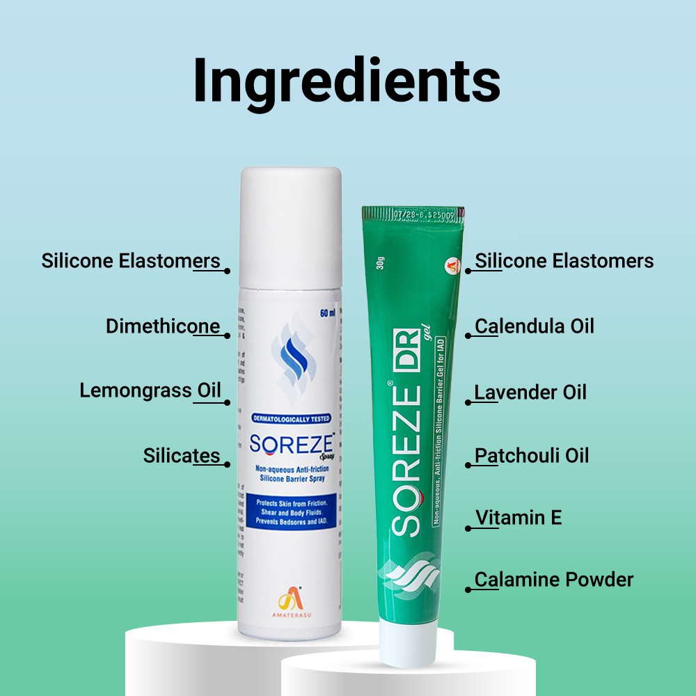 Soreze Spray is a no-sting, non-sticky, non-skin protectant barrier film infused with silicone elastomers, dimethicones, lemongrass oil and an improved Aerosol technology that prevents bedsores and adult diaper rashes. The spray creates a long-lasting protective high-quality barrier film on the skin, shielding it from friction, shear, and body fluids.